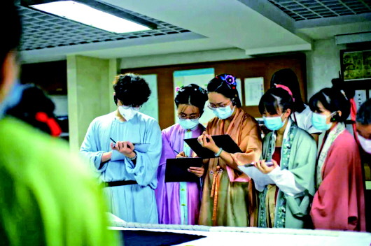 漢服商家、研究者們在中國絲綢博物館仔細(xì)記錄文物細(xì)節(jié)。(陳潤熙/攝)
