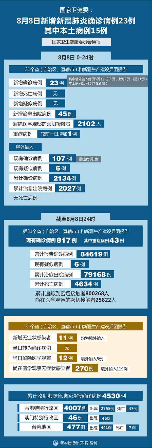 截至8月8日24時(shí),據(jù)31個(gè)省(自治區(qū)、直轄市)和新疆生產(chǎn)建設(shè)兵團(tuán)報(bào)告,現(xiàn)有確診病例817例(其中重癥病例43例),累計(jì)治愈出院病例79168例,累計(jì)死亡病例4634例,累計(jì)報(bào)告確診病例84619例,現(xiàn)有疑似病例6例。累計(jì)追蹤到密切接觸者800268人,尚在醫(yī)學(xué)觀察的密切接觸者25822人。