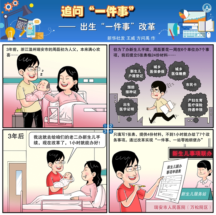 從6個部門的5張表格、24份材料,到群眾生活中的“一件事、一站零跑順便辦”,2019年7月,瑞安出生“一件事”改革經(jīng)驗開始在浙江全省推廣。