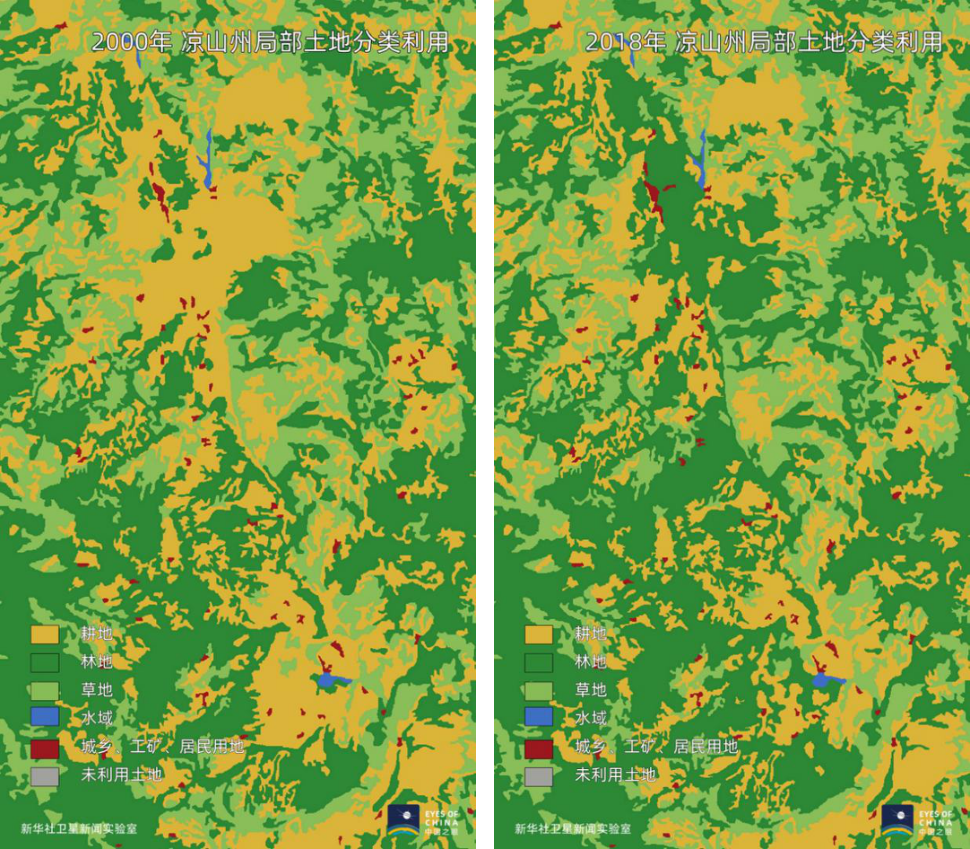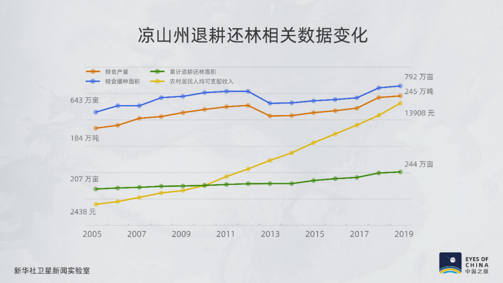 累計退耕還林超過243.8萬畝,衛(wèi)星觀察到涼山植被的變化,反映出水土流失被控制、減緩以及扭轉的全過程,糧食年產量實現(xiàn)高達50%的增長。