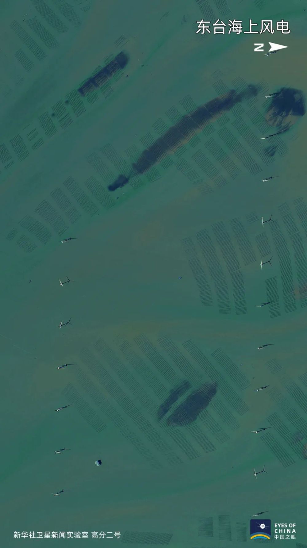 江蘇東臺,漁排間的海上風電機星星點點。2019年中國可再生能源發(fā)電總裝機容量達到7.94億千瓦,占全部電力裝機的39.5%。