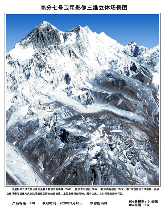 這是高分七號衛(wèi)星于2020年3月18日獲取的珠穆朗瑪峰三維立體場景圖。? 新華社發(fā)(國家航天局提供)