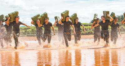 中隊官兵扛著彈藥箱在泥水中訓練沖刺。記者 金 歆攝