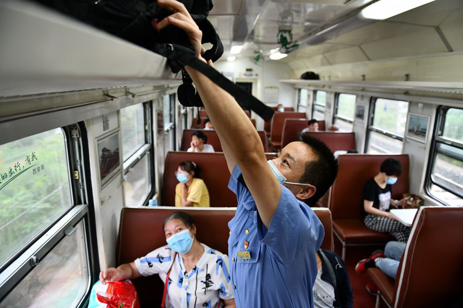 乘務員在漢中站核查8361次旅客身份證。(8月22日攝)