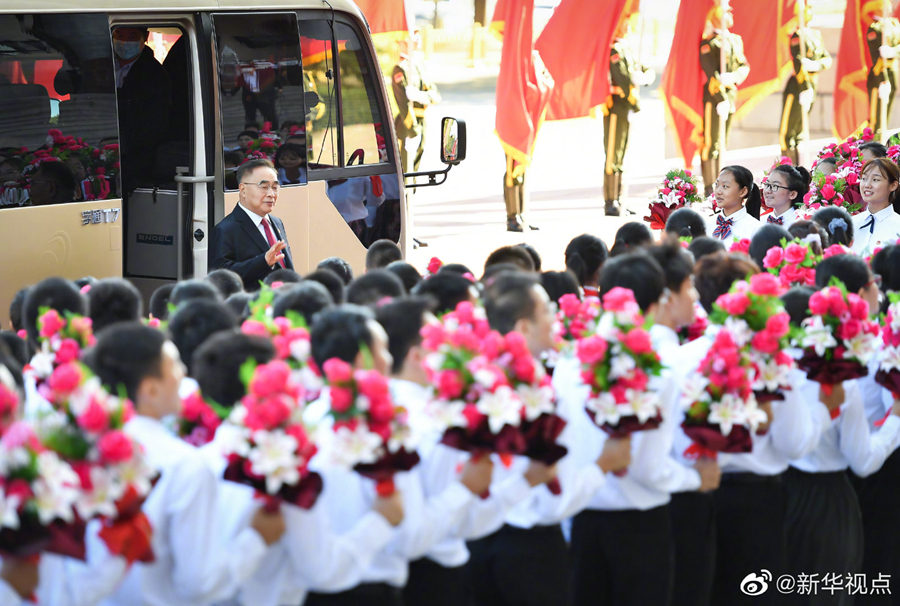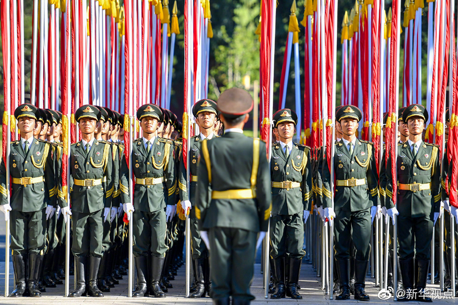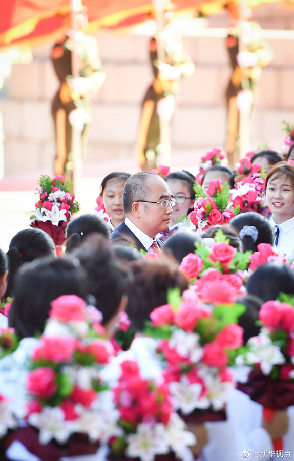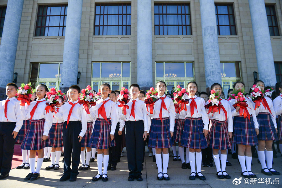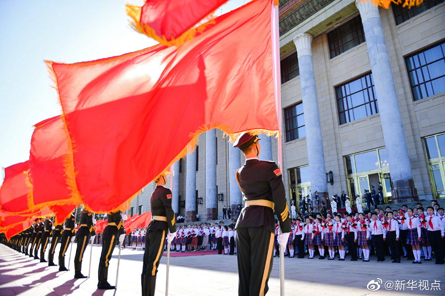 人民大會堂北門外,高擎紅旗的禮兵分列道路兩側(cè),肩槍禮兵在臺階上莊嚴佇立,青少年熱情歡呼致意。國家勛章和國家榮譽稱號獲得者沿著紅毯拾級而上,進入人民大會堂。