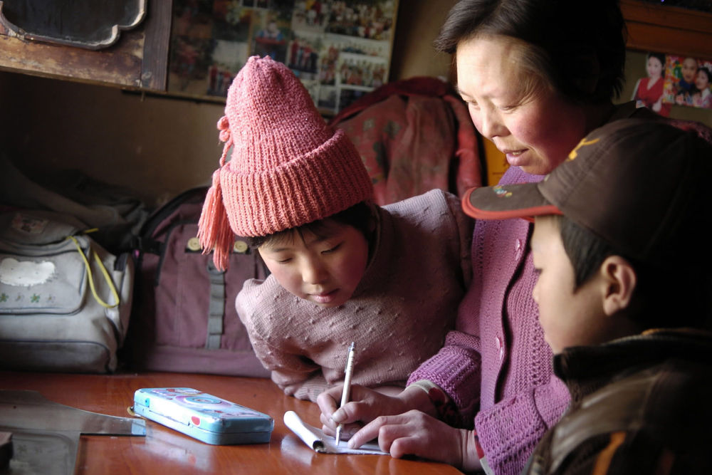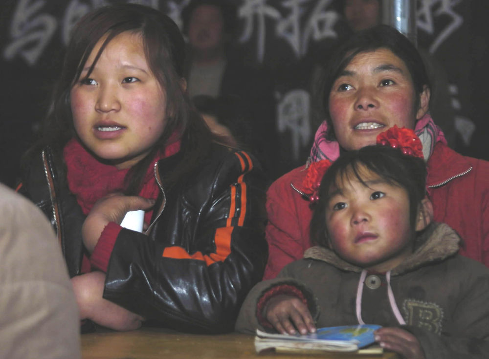 ↑ 2006年1月13日,“掃盲夜校”學員在甘肅漳縣三岔鎮中心小學上課。
