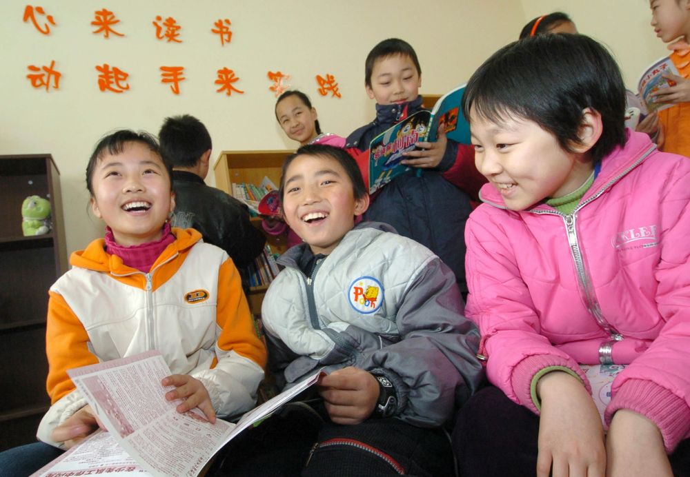 ↑ 這是2008年9月1日,江西樟樹市第二小學五(1)班鄧文俊(中)等同學領到免費教科書。