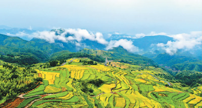 鳥瞰浙江省臺州市仙居縣朱溪鎮(zhèn)楊豐山金色梯田美景。 王華斌攝(人民圖片)