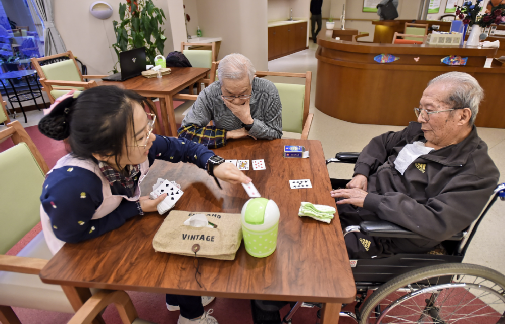 北京市豐臺區新村街道社區養老中心的工作人員在陪老人做游戲(李欣/ 攝)