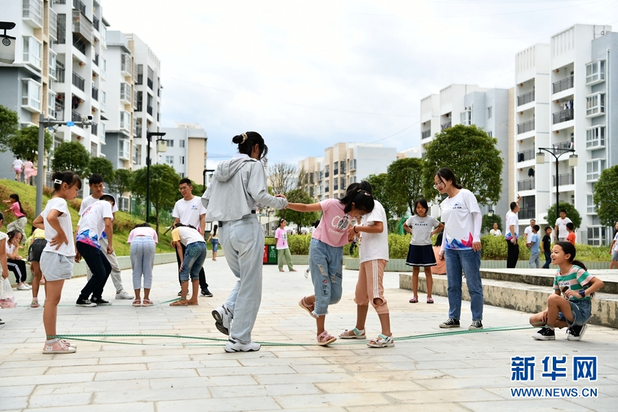 8月13日,在貴州省思南縣雙塘街道麗景社區易地扶貧搬遷安置點,孩子們和志愿者一起跳皮筋。新華社記者 楊文斌 攝