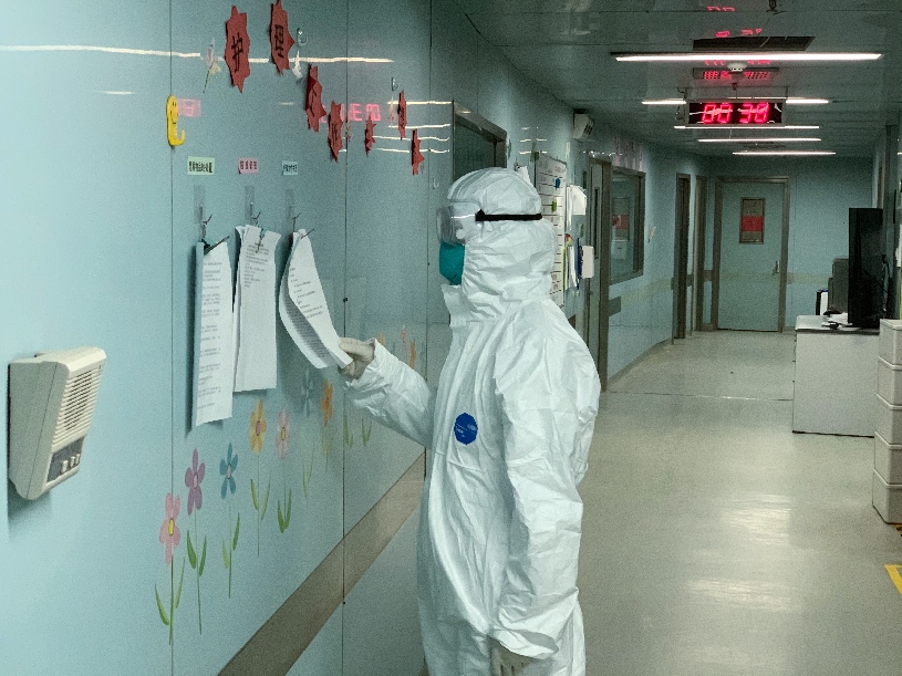 2月26日凌晨,人民日報記者吳姍在武漢市金銀潭醫(yī)院ICU重癥病區(qū)采訪。