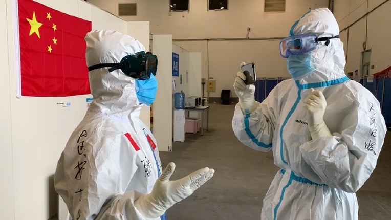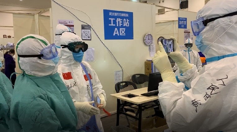 3月7日,武漢首批最大規(guī)模方艙醫(yī)院東西湖方艙醫(yī)院休艙現(xiàn)場,人民日報記者吳姍(右)見證最后一批轉院患者出艙。