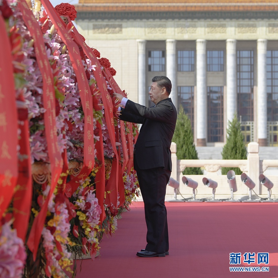9月30日上午,黨和國家領導人習近平、李克強、栗戰書、汪洋、王滬寧、趙樂際、韓正、王岐山等來到北京天安門廣場,出席烈士紀念日向人民英雄敬獻花籃儀式。這是習近平整理花籃上的緞帶。 新華社記者 申宏 攝