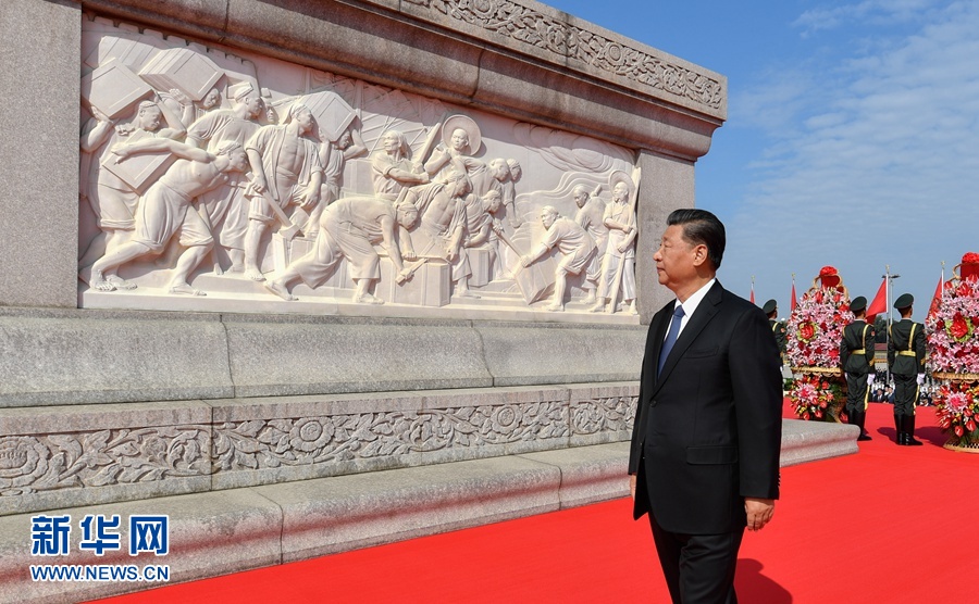 9月30日上午,黨和國家領導人習近平、李克強、栗戰書、汪洋、王滬寧、趙樂際、韓正、王岐山等來到北京天安門廣場,出席烈士紀念日向人民英雄敬獻花籃儀式。這是習近平瞻仰人民英雄紀念碑。 新華社記者 岳月偉 攝