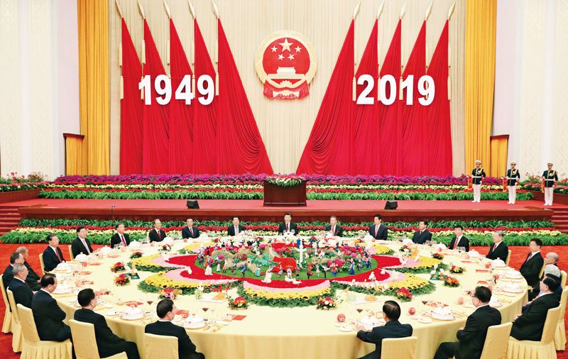 2019年9月30日晚,慶祝中華人民共和國成立70周年招待會在北京人民大會堂隆重舉行。習近平、李克強、栗戰書、汪洋、王滬寧、趙樂際、韓正、王岐山等黨和國家領導人與4000余名中外人士歡聚一堂,共慶新中國70華誕。 新華社記者 黃敬文/攝