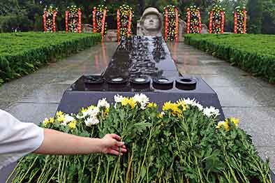 在臺兒莊無名烈士墓前,一位青年獻花(8月15日攝)。新華社記者郭緒雷攝