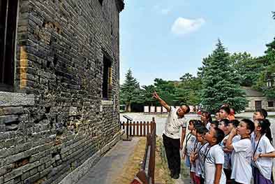 在臺兒莊大戰遺址公園彈孔墻前,作家時培京(左一)給孩子講述歷史(8月19日攝)。新華社記者郭緒雷攝