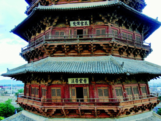 它巍然聳立在晉北廣袤的大地上,有20多層樓高,平面八角形,明五暗四共九層,外觀五層六檐,底層重檐出挑深遠。全塔有50余種斗拱裝點,宛如一朵朵盛開的蓮花,每一明層中心供奉佛像。登塔觀覽,桑干似帶,恒岳如屏。
