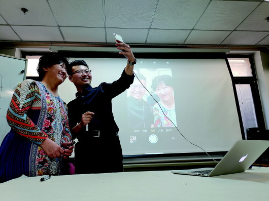 ▲志愿者隋明哲(右)在教老年人用美圖秀秀時與老人自拍合影。受訪者供圖
