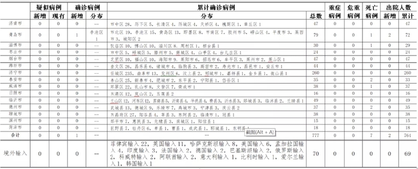山東新增本地確診病例1例。累計報告確診病例777例,死亡7例。新增治愈出院病例2例,累計治愈出院764例。