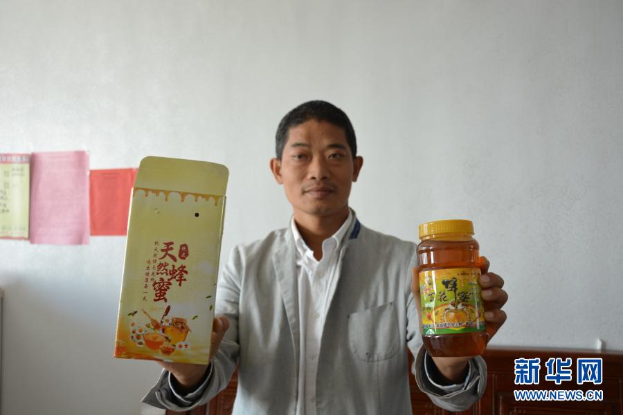 在福建省龍巖市長汀縣,劉春生在家中展示他養(yǎng)殖的蜜蜂所產(chǎn)蜂蜜(11月11日攝)。新華社記者 張華迎 攝
