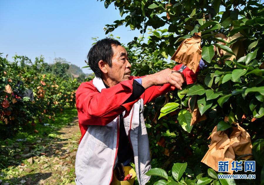 在四川省資陽市安岳縣寶森檸檬小鎮(zhèn)世界檸檬品種博覽園,安岳縣檸檬產(chǎn)業(yè)發(fā)展中心主任田再澤在查看檸檬的長勢情況(11月11日攝)。新華社記者 周相吉 攝