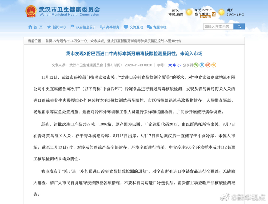 武漢市發現3份巴西進口牛肉標本新冠病毒核酸檢測呈陽性,未流入市場-新華網