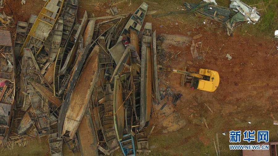 在湖南常德漢壽縣蔣家嘴鎮,工作人員在洞庭湖邊駕駛挖掘機拆解漁民上交的漁船(2019年12月17日攝,無人機照片)。新華社記者 薛宇舸 攝