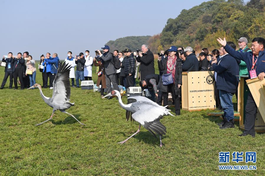 2019年12月8日,國內多家野生動物保護機構在江西鄱陽湖國家級自然保護區將120只被救治的珍稀候鳥成功放飛。這是工作人員放飛兩只白枕鶴。新華社記者 萬象 攝