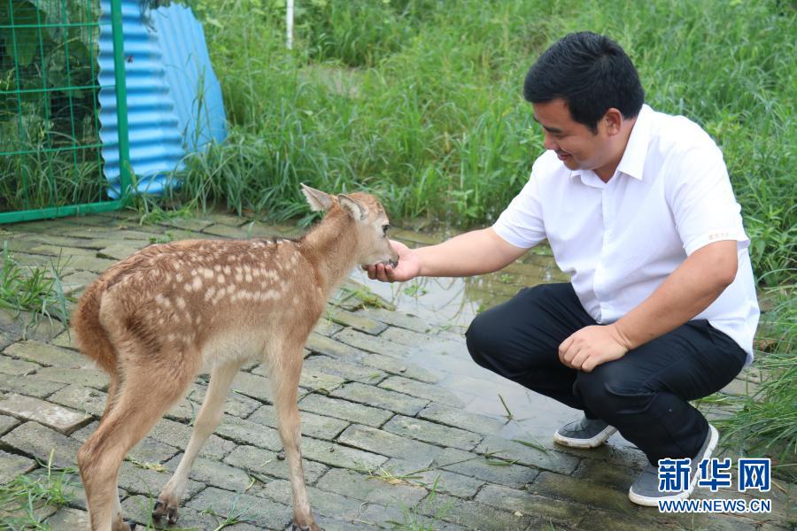 東洞庭湖麋鹿保護協會會長李政與小麋鹿“果果”互動(7月8日攝)。新華社記者 蔡瀟瀟 攝