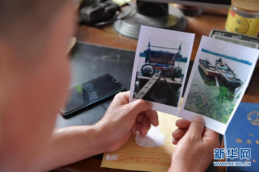 在江西省南昌市新建區象山鎮,上岸漁民吳華山在展示自己珍藏的兩張漁船的照片。這兩條船是吳華山還在當漁民時使用的捕撈船只,上岸轉業之后,船只上交,他用領到的補貼開始承包魚塘養殖小龍蝦(6月5日攝)。新華社記者 彭昭之 攝