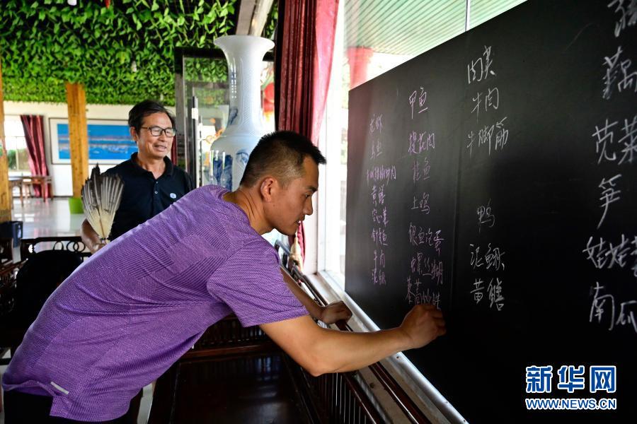 在江西省余干縣田園鄱陽湖景區,上岸漁民朱義才(后)在自己開辦的農家樂內和兒子一起寫當日的菜譜(6月16日攝)。新華社記者 彭昭之 攝