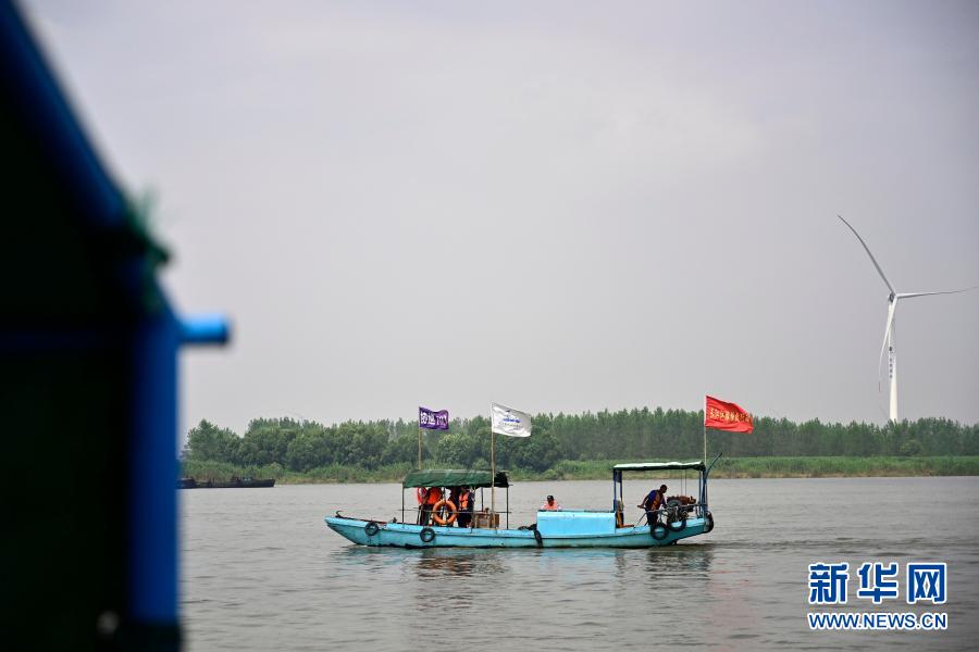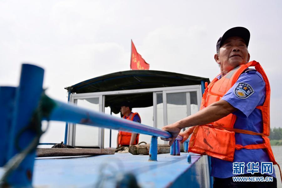 在江西省湖口縣,江豚協助巡護隊的隊員伍后春在觀察水面是否有違法捕撈的工具。他和他的父親、爺爺三代在鄱陽湖和長江捕魚為生,2017年開始上岸,目前已成為巡護隊隊員(6月8日攝)。新華社記者 彭昭之 攝