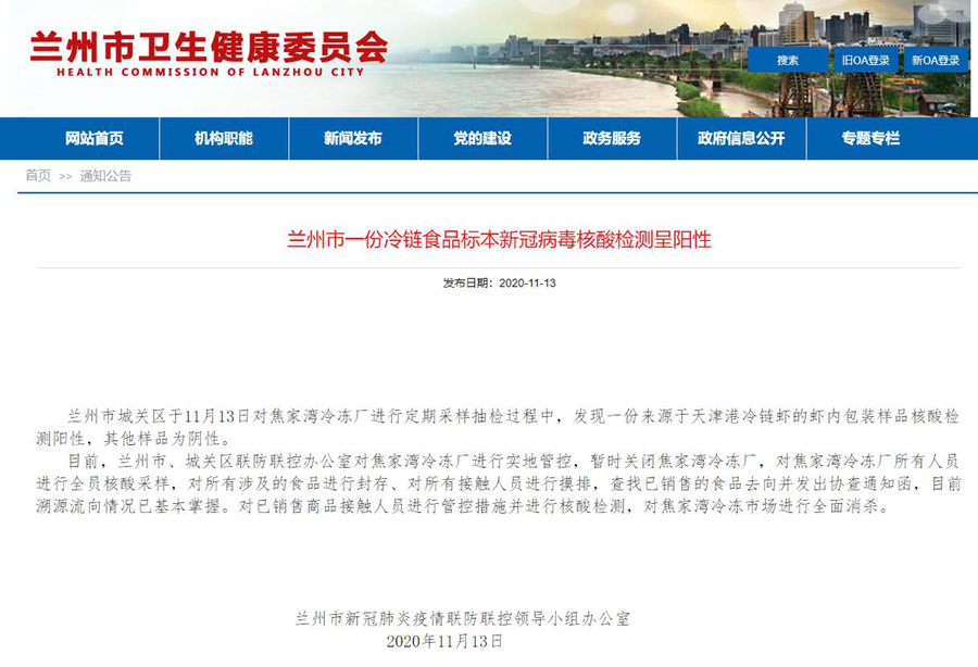 蘭州市城關(guān)區(qū)于11月13日對焦家灣冷凍廠進(jìn)行定期采樣抽檢過程中,發(fā)現(xiàn)一份來源于天津港冷鏈蝦的蝦內(nèi)包裝樣品核酸檢測陽性,其他樣品為陰性。