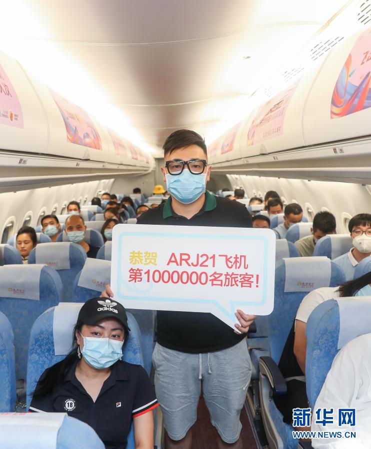 7月20日晚,ARJ21飛機的第100萬名乘客在機艙內拍照留念。該架飛機從上饒三清山機場起飛,在成都雙流機場降落。新華社記者 丁汀 攝