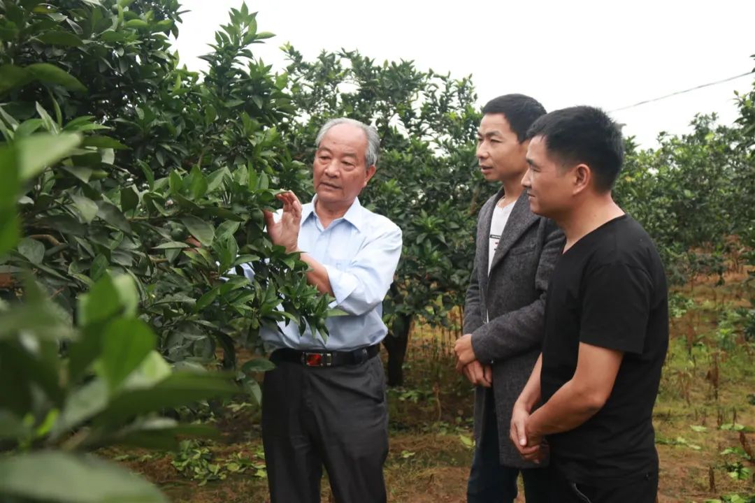 2020年5月23日,贛州市信豐縣大塘長崗村的客鄉橙園里,“贛南臍橙引種第一人”袁守根(左)在傳授臍橙種植技術 劉青 攝