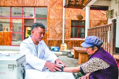 云南貢山獨龍族怒族自治縣獨龍江鄉巴坡村,村醫在給獨龍族老人測量血壓。 新華社發