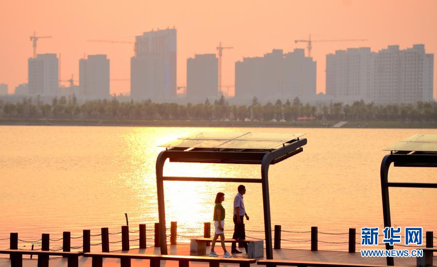 市民在駐馬店市新蔡縣東湖景觀大道休閑(2019年6月13日攝)。新華社發