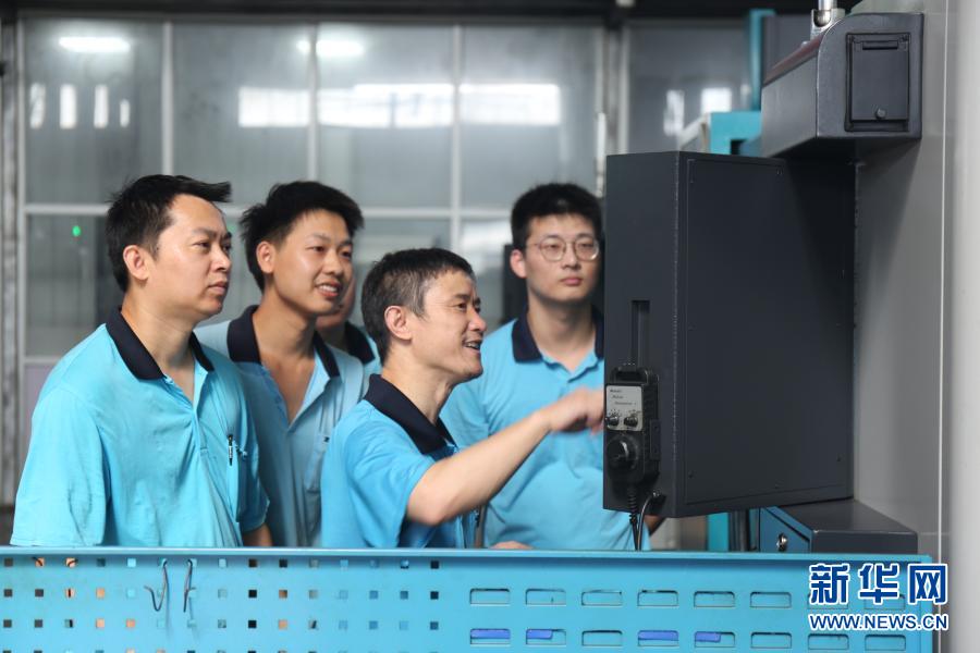 全國勞動模范、寧波中大力德智能傳動股份有限公司設(shè)備科科長萬亞勇(右二)在車間指導(dǎo)員工進(jìn)行數(shù)控機床故障診斷(8月17日攝)。新華社發(fā)
