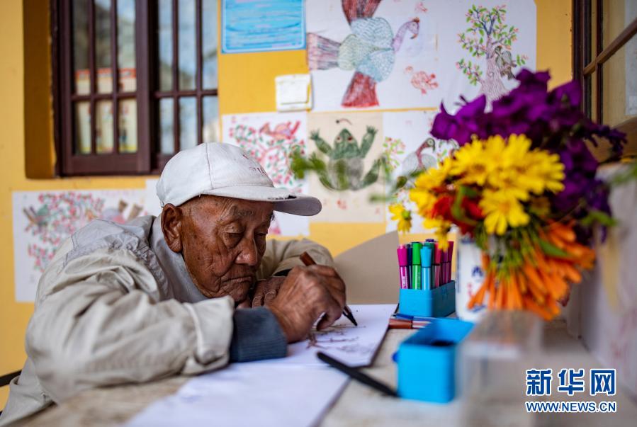 彝族老農(nóng)羅家政坐在家門(mén)口畫(huà)畫(huà)(11月30日攝)。新華社記者 江文耀 攝
