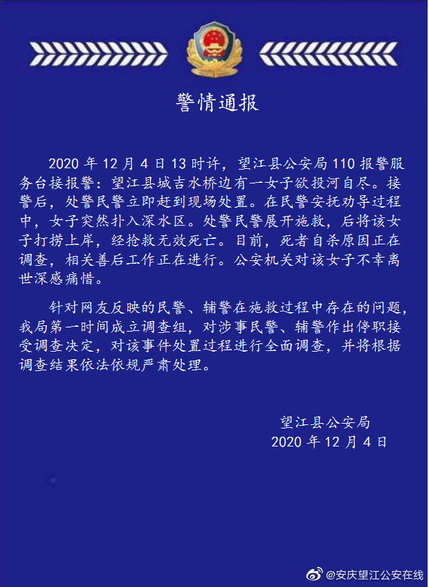 女子投河自盡,民警營救不力?涉事者被停職調查