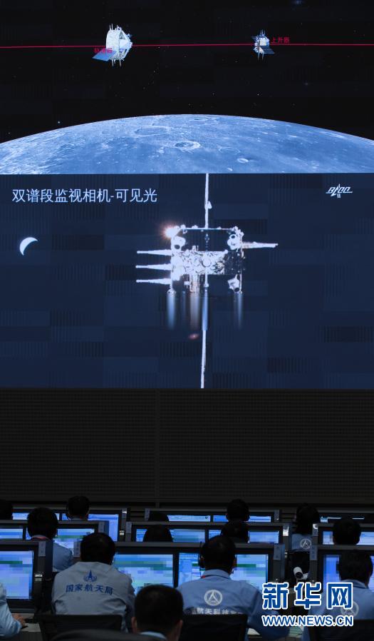 記者從國(guó)家航天局獲悉,12月6日5時(shí)42分,嫦娥五號(hào)上升器成功與軌道器返回器組合體交會(huì)對(duì)接,并于6時(shí)12分將月球樣品容器安全轉(zhuǎn)移至返回器中。這是我國(guó)航天器首次實(shí)現(xiàn)月球軌道交會(huì)對(duì)接。新華社記者 金立旺 攝