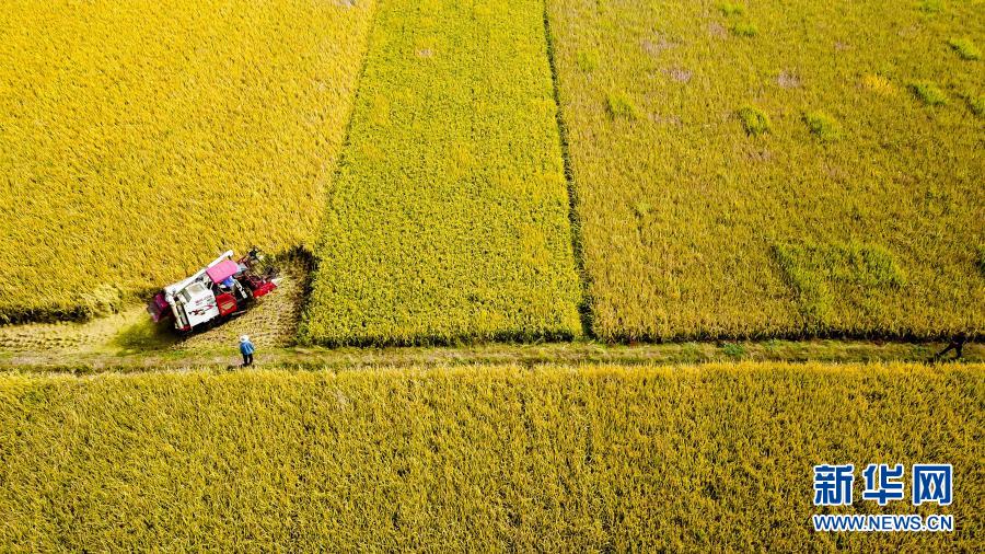 10月21日,在棗莊市臺兒莊區邳莊鎮,收割機在收獲水稻(無人機照片)。