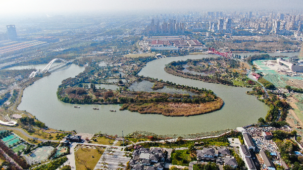 這是11月14日拍攝的江蘇省揚州市運河三灣生態文化公園景色(無人機照片)。新華社記者 季春鵬 攝