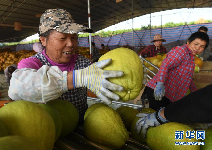 在廣西羅城仫佬族自治縣金玉柚生態產業扶貧示范區,村民在分揀柚子準備裝車外銷(2019年11月5日攝)。新華社記者 陸波岸 攝