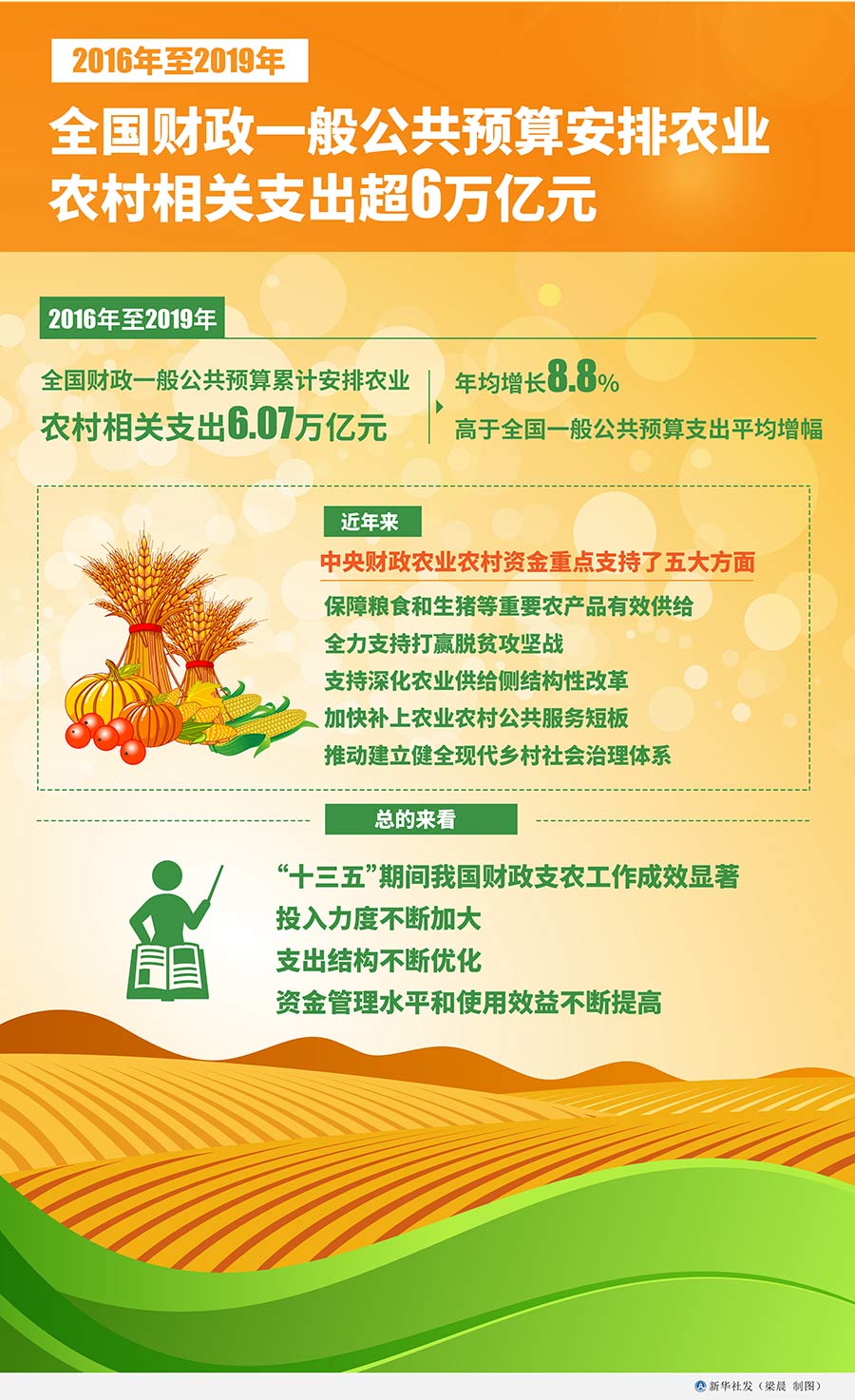 他表示,近年來,中央財政農業農村資金重點支持了五大方面:保障糧食和生豬等重要農產品有效供給;全力支持打贏脫貧攻堅戰;支持深化農業供給側結構性改革;加快補上農業農村公共服務短板;推動建立健全現代鄉村社會治理體系。總的來看,“十三五”期間我國財政支農工作成效顯著,投入力度不斷加大,支出結構不斷優化,資金管理水平和使用效益不斷提高。