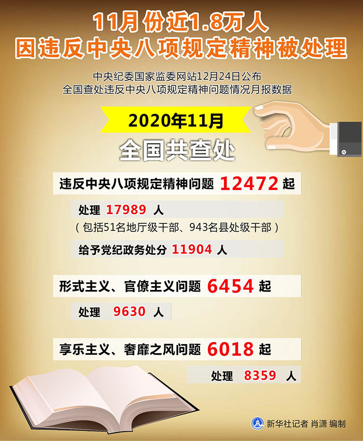 新華社北京12月24日電(記者孫少龍)中央紀(jì)委國家監(jiān)委網(wǎng)站24日公布全國查處違反中央八項(xiàng)規(guī)定精神問題情況月報(bào)數(shù)據(jù)。通報(bào)顯示,2020年11月,全國共查處違反中央八項(xiàng)規(guī)定精神問題12472起,處理17989人(包括51名地廳級干部、943名縣處級干部),給予黨紀(jì)政務(wù)處分11904人。