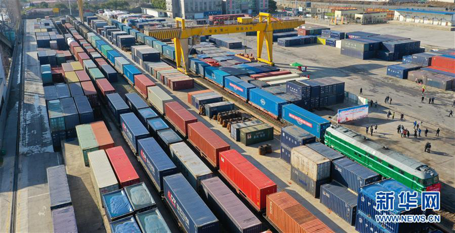2月17日,中歐班列(南昌)在南昌向塘鐵路口岸等待發(fā)車(無(wú)人機(jī)照片)。 新華社記者 胡晨歡 攝