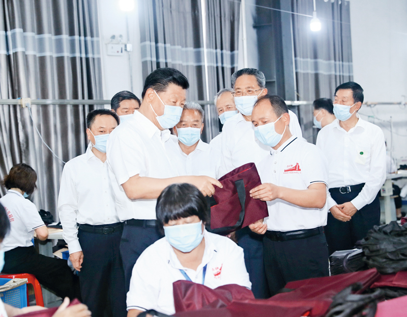 2020年8月18日至21日,中共中央總書記、國家主席、中央軍委主席習近平在安徽省考察。這是18日下午,習近平在阜陽市阜南縣紅亮箱包有限公司察看車間生產線,了解企業災后恢復生產和受災群眾、貧困群眾就業情況。 新華社記者 鞠鵬/攝