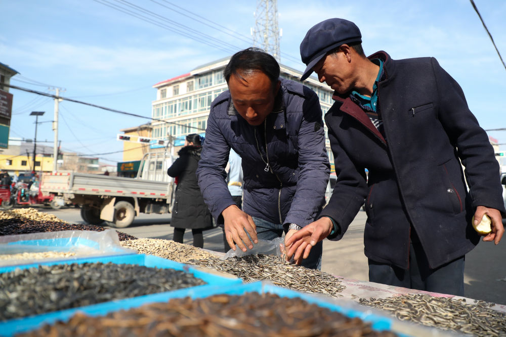 2月7日,在甘肅省定西市渭源縣會川鎮(zhèn)集市上,元古堆村村民曾玉成(右)在置辦年貨。新華社記者 馬希平 攝